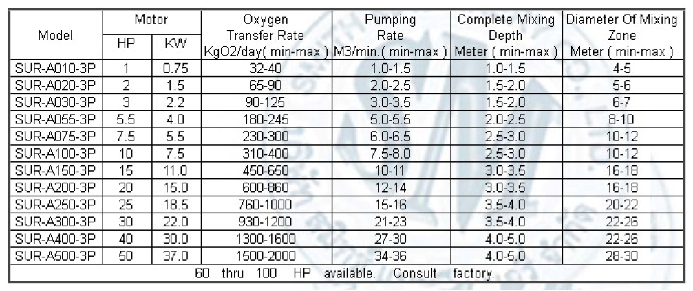 ใช้มอเตอร์ IEC Standard มีขนาดมาตรฐานตั้งแต่ 1-30 แรงม้า สามารถทำงานได้ตลอด 24 ชั่วโมง ( Heavy Duty) ใช้กับบ่อน้ำเสียทุกประเภท บ่อเลี้ยงกุ้ง บ่อเลี้ยงปลา หมู่บ้าน สนามกอล์ฟ และ แหล่งน้ำต่างๆ ใช้กับบ่อที่มีความลึกตั้งแต่ 1.5 เมตรขึ้นไป ปริมาณออกซิเจนที่เติมได้ในน้ำ 1.2-1.5 KgO2/ Hp-hour อายุการใช้งานที่ยาวนาน เนื่องจากตัวเครื่องทำด้วยสแตนเลส